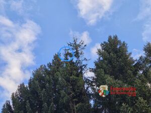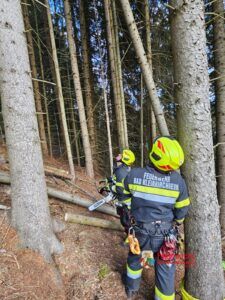 Bei der Erkundung durch die Einsatzkräfte stellte sich heraus, dass sich das Tier in einer Höhe von rund 20 Metern befand. Aufgrund der örtlichen Gegebenheiten war der Einsatz einer Drehleiter nicht möglich, auch andere Rettungsmöglichkeiten konnten ausgeschlossen werden. Der Einsatzleiter entschied daher, den betroffenen Baum unter gleichzeitiger Sicherung mittels Greifzug kontrolliert zu fällen.